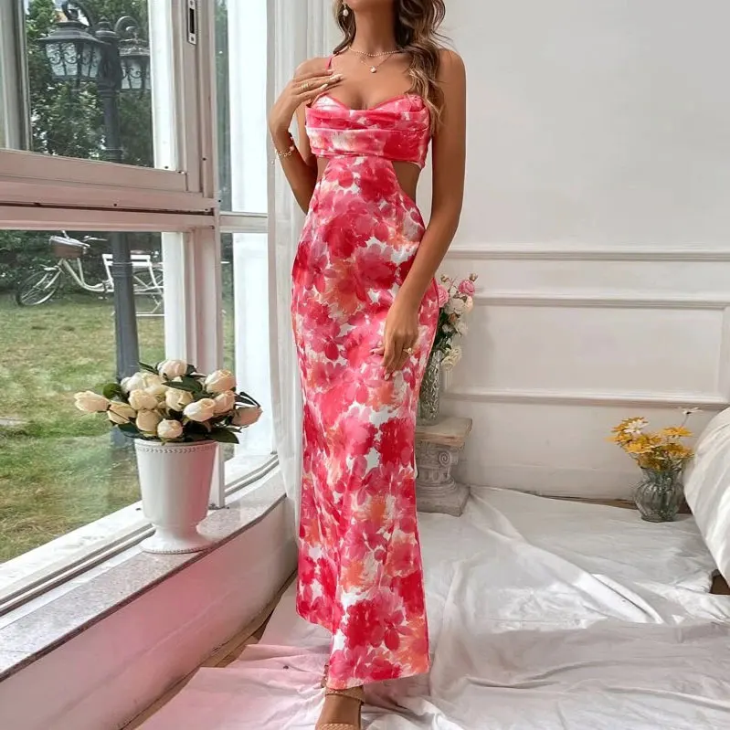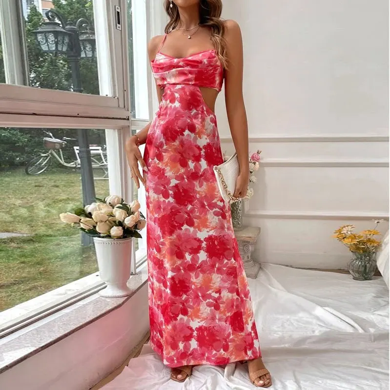 Huilong Elegant Slip Women's High Quality Maxi Dress Custom Printed Floral Prom Floral Dress for Summer Floor-Length Cut Out